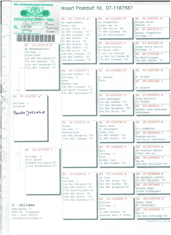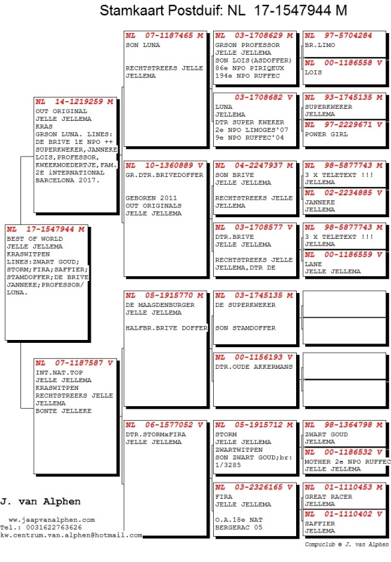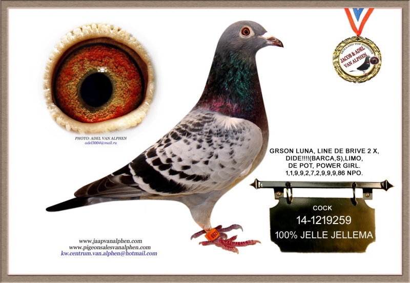 JELLE JELLEMA COCK 2017-1547944 HIS FATHER OIUT ORIGINALS FROM THE OLD BEGINNING LINES: "DE BRIVE", TOPRACER, "LUNA", 2E+9E NPO;"JANNEKE","LANE", "POWER GIRL";"LIMO","PROFESSOR" HIS MOTHER OUT "MAAGDENBURGER" X DTR "STORM";DTR "OUDE AKKERMANS", BREEDER OF " ZWART GOUD";"STORM"; "SAFFIER";"ZWART GOUD";"FIRA". THE MOTHER PF THIS COCK "BONTE JELLEKE", IS MOTHER OF NATIONAL TOPPERS, SO THIS COCK IS BROTHER OF THEM!!!