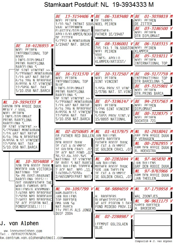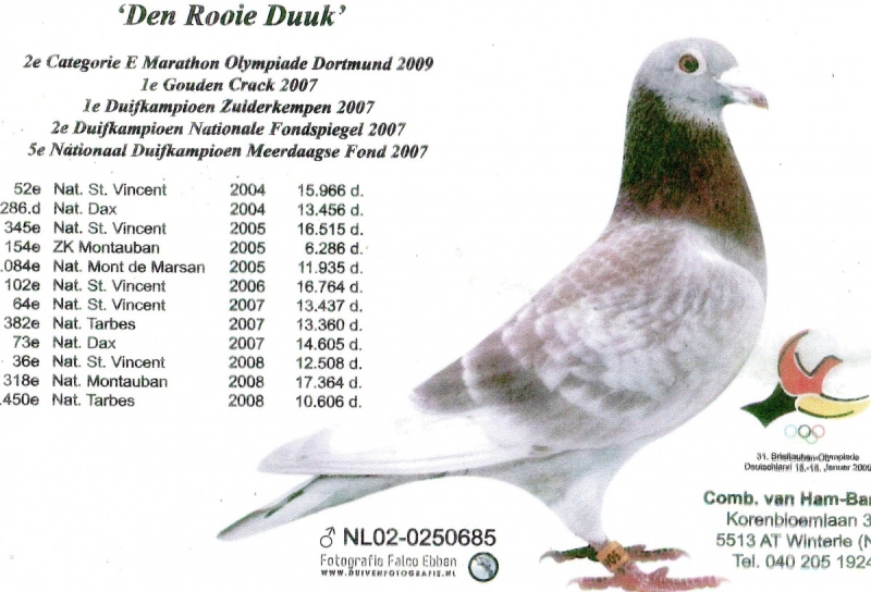 JAN BULLENS COCK,GRDSON DEN ROOIE DUUK, THE GRFTR OF RED BULLENS NOW FROM GERARD KOOPMAN, HIS MOTHER 1/2 SISTER OF THE MOTHER OF HIM. HE WON:1E NPO AFD.3 BERGERAC 2011 + 2E NPO AFD.3 BORDEUX 2008 + 2E NPO AFD. BERGERAC 2010(RESP.4288,5038,4651 PIGEONS IN RACE). THE CHILDREN OF RED BULLENS ARE BRILLIANT WINNES/RACERS.DEN ROOIE DUUK:2E CAT. MARATHON OLYMPIC DORTMUND+1E GOLDEN CRACK+1E ACE ZUIDERKEMPEN+2E NAT. FONDSPIEGEL. FATHER OF THIS COCK IS ORIGINAL NOEL PEIRREN,GRSON "TARBES"OUT DE ZITTER + DTR DIPLOMAAT,,SISTER "NIKA",1E INTNAT SOUSTON,DE SINT VINCENT,WORLD CHAMPION BIG FOND,OUT KLAMPER; LINES MORE:5 NAT. MONTAUBAN,5 NAT.BARCA,9 INTNAT BARCA,6 NAT.BERGERAC,8 NAT.ST.VINCENT,12 NAT.DAX.SISTER OF THIS COCK, VICTORIA, 3E BARCA O.BRABANT. HE HAS BRILLIANT EYES. THIS FAMILY FROM ALL SIDES NAT. TOPRACERS!!!!!!!!!!!!!!!!!! THIS IS THE TOP CROSS, BY GERATD KOOPMAN RED BULLENS X NOEL PEIREN!!!!