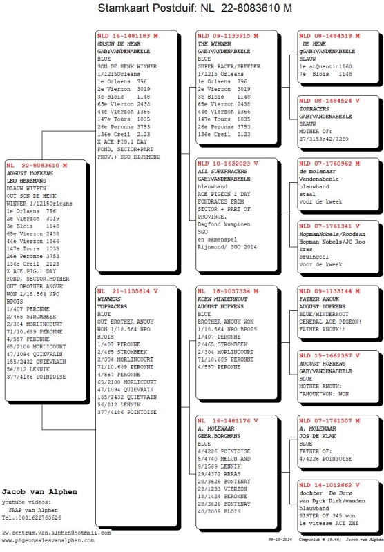 22-8083610 GABYVDABEELE/AUGUST HOFKENS/JANSEN A,DONK COCK OUT SON DE HENK WINNER 1/1215Orleans 1e Orlaens 796 2e Vierzon 3019 3e Blois 1148 65e Vierzon 2438 44e Vierzon 1366 147e Tours 1035 26e Peronne 3753 136e Creil 2123 X ACE PIG.1 DAY FOND, SECTOR.MOTHER OUT BROTHER ANOUK WON 1/18.564 NPO BPOIS 1/407 PERONNE 2/465 STROMBEEK 2/304 MORLINCOURT 71/10.689 PERONNE 4/557 PERONNE 65/2100 MORLICOURT 47/1094 QUIEVRAIN 155/2432 QUIEVRAIN 56/812 LENNIK 377/4186 POINTOISE BROTHER OF MANY TOP PRIE WINNERS!!!!!