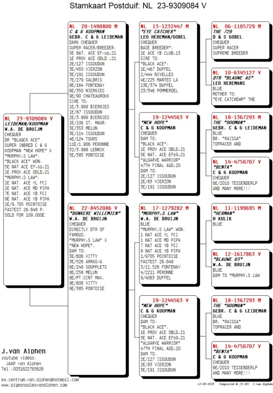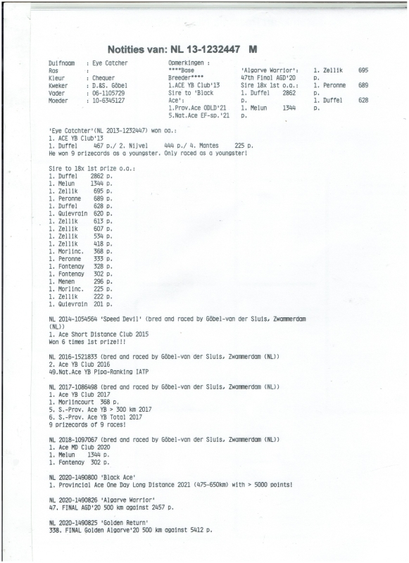 2023-9309084 WILLEM DE BRUIJN/ GERARD KOOPMAN HEN GRANDDAUTHER "MURPHY,S LAW” SOLD FOR 109.000E ONE OF THE BEST PIGEONS EVER IN HOLLAND. DR "BLACK ACE" SUPER INBRED C & G KOOPMAN "NEW HOPE" X "MURPHY,S LAW". "BLACK ACE" WON: 5E NAT ACE EF-sp,21 1E PROV.ACE ODLD,21 "MURPHY,S LAW": 1E NAT. ACE YL FCI 1E NAT. ACE MD PIPA 7E NAT. ACE YB FCI 9E NAT. ACE YB PIPA 1E/9.705 POINTOISE FASTEST 26.648 P. SOLD FOR 109.000E