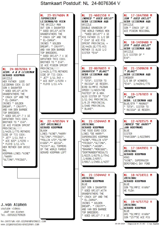 2024-8076364 GEBR. LEIDEMAN/ GERARD KOOPMAN HEN HER FATHER 100% LEIDEMAN COCK IS OUT SON X DAUGHTER " GOED GRIJS",WITH GRANDFATHERS THE " CRACK 19" AND THE " EL-ZARKA". ININES " GOLDEN DREAM", " CRUYFF", AND VAN DEN BARNDE TOP BREEDERS. " GOED GRIJS":7 X 1E GRFATHER THIS COCK: BROTHER TO " EVA": 1E ACE PIGEON SPRINT PROVINCIAL!!!! 1/4429,1/770. MOTHERSSIDE OF TIS COCK: " JET" 1/11.343 + " ACE 820":1/5230 + " FLOYD 1/11.474 HER MOTHER OUR ORIGINAL GERARD KOOPMAN:LINES:"AINE","HARRY "ALTIMA","FRIDUS", "POLLIN 470","OLYMP KYARA","" ADISA", "KICKY".ALL TOPPERS OF THE WORLD FAMOUS GERARD KOOPMAN LOFT