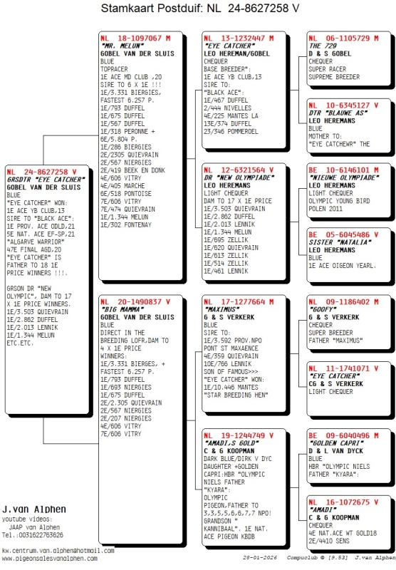 C & G VERKERK/LEO HEREMANS HEN GRDTR " EYE CATCHER". "EYE CATCHER" WON: 1E ACE YB CLUB,13 SIRE TO "BLACK ACE": 1E PROV. ACE ODLD,21 5E NAT. ACE EF-SP,21 "ALGARVE WARRIOR" 47E FINAL AGD,20 "EYE CATCHER" IS FATHER TO 18 1E PRICE WINNERS !!!. GRSON DR "NEW OLYMPIC", DAM TO 17 X 1E PRICE WINNERS. 1E/3.503 QUIEVRAIN 1E/2.862 DUFFEL 1E/2.013 LENNIK 1E/1.344 MELUN ETC.ETC.