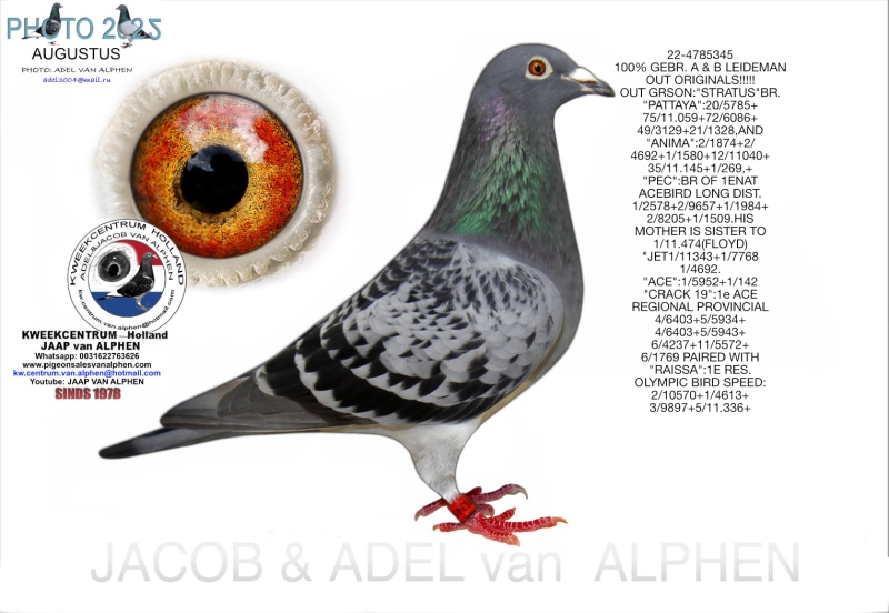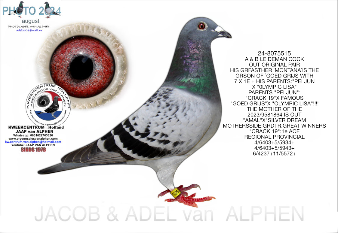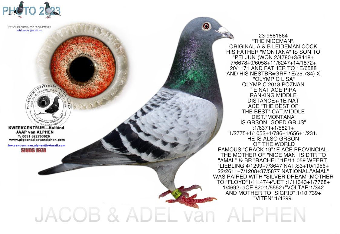 25-1550047 A & B LEIDEMAN COCK DIRECTLY SON OF "THE BEAUTY", SON OF "THE NICE MAN”. THE GRFATHER OF "THE BEAUTY" GRFTR `MONTANA`IS THE GRSON OF `GOED GRIJS WITH 7 X 1E + HIS PARENTS:"PEI JUN X "0LYMPIC LISA" PARENTS "PEI JUN": "CRACK 19"X FAMOUS "GOED GRIJS”X "OLYMPIC LISA"!!!! THE MOTHER OF THE 2023/9581864 IS OUT "AMAL"X"SILVER DREAM MOTHERSSIDE:GRDTR. GREAT WINNERS "CRACK 19":1e ACE REGIONAL PROVINCIAL 4/6403+5/5934+ 4/6403+5/5943+ 6/4237+11/5572+ HIS MOTHER"OUT GRSON: "STRATUS"BR. "PATTAYA":20/5785+ 75/11.059+72/6086+ 49/3129+21/1328,AND "ANIMA":2/1874+2/ 4692+1/1580+12/11040+ 35/11.145+1/269,+ "PEC":BR OF 1ENAT ACEBIRD LONG DIST. 1/2578+2/9657+1/1984+2/8205