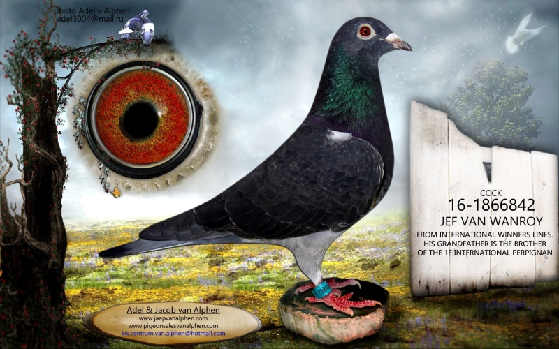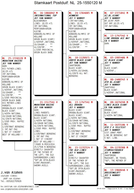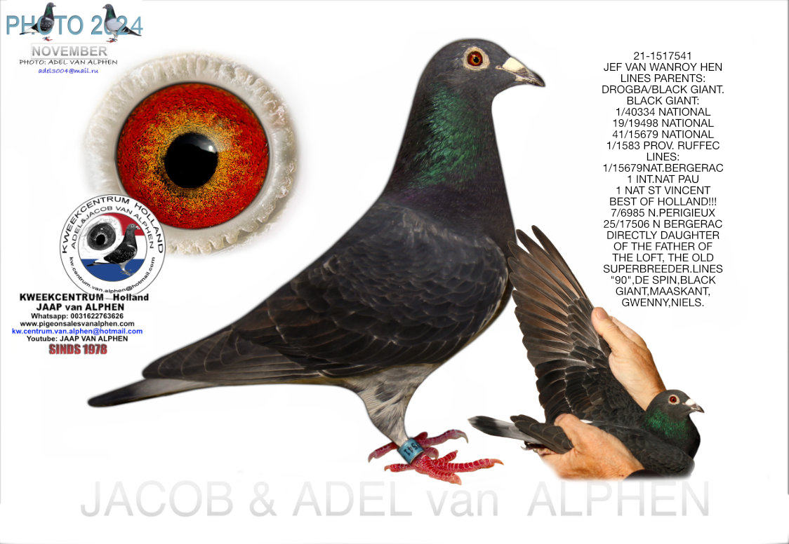 2025-1550120 JEF VAN WANROY COCK HIS FATHER:LINES: 1E/25.471 INT.NATIONAL PERPIGNAN+GRSON KLEINE DONKERE/OLYMPIC OF HOLLAND GRSON BLACK GIANT/ 1/40334P.,NATIONAL 19/19498P., "" 41/15679P. "" 1/1583 PROVINCIAL GRSON BLACK BABE HIS MOTHER:LINES PARENTS: DROGBA/BLACK GIANT. BLACK GIANT: 1/40334 NATIONAL 19/19498 NATIONAL 41/15679 NATIONAL 1/1583 PROV. RUFFEC LINES: 1/15679NAT.BERGERAC 1 INT.NAT PAU 1 NAT ST VINCENT BEST OF HOLLAND!!! 7/6985 N.PERIGIEUX 25/17506 N BERGERAC DIRECTLY DAUGHTER OF THE FATHER OF THE LOFT, THE OLD SUPERBREEDER.LINES "90",DE SPIN,BLACK GIANT,MAASKANT, GWENNY,NIELS.