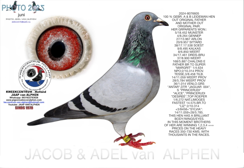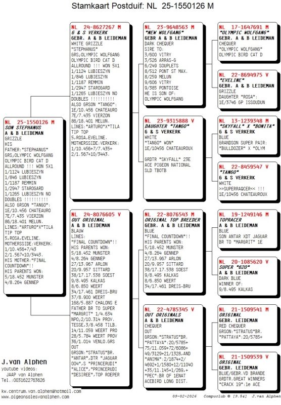 25-1550126 A & B LEIDEMAN/G & S VERKERK COCK HIS FATHER "STEPHANUS" GRS;OLYMPIC WOLFGANG OLYMPIC BIRD CAT D ALLROUND !!! WON 5X1 1/1124 LUBIESZYN 1/846 LUBIESZYN 1/1187 REMMIN 1/2947 STAROGARD 1/1265 LUBIESZYN NO DOUBLES !!!!!!!!!! ALSO GRSON "TANGO": 1E/10.456 CHATEAURO 7E/7.435 VIERZON 86/18.401 MELUN. LINES:"ARTURO"X"TILA TIP TOP 5,ROSA,EVELINE. MOTHERSSIDE:VERKERK: 1/10.456+ 2/1.567+10/3443. HIS MOTHER:"FINAL COUNTDOWN"!! HIS PARENTS WON: 5/18.452 MUNSTER 4/8.264 GENNEP 27/13.967 ARLON 20/9.957 SITTARD 38/17.17.538 SOEST 9/8.495 KALKAS 8/6.850 WEERT 34/17.461 DREIS-BRU 37/8.900
