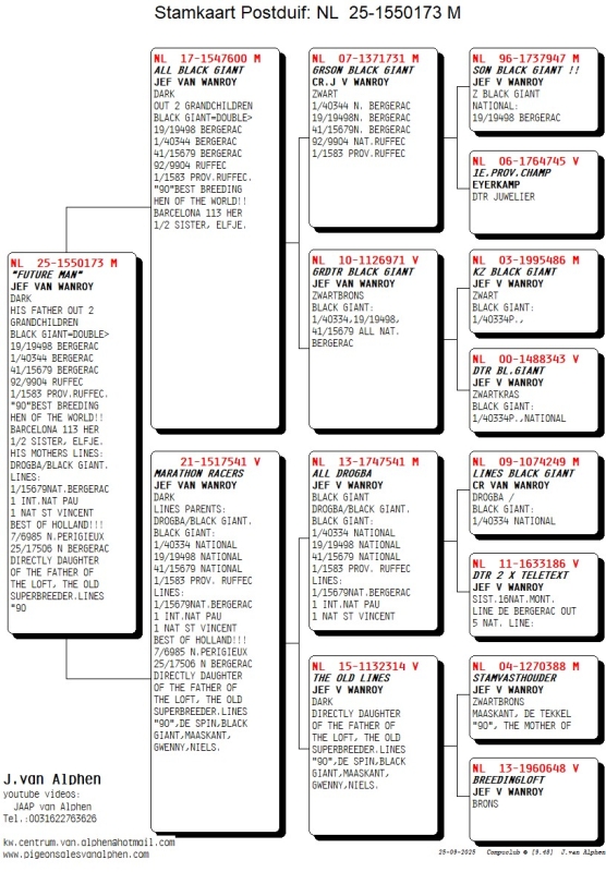 2025-1550173 "THE FUTURE MAN"!!! JEF VAN WANROY INBRED BLACK GIANT COCK HIS FATHER OUT 2 GRANDCHILDREN BLACK GIANT=DOUBLE> 19/19498 BERGERAC 1/40344 BERGERAC 41/15679 BERGERAC 92/9904 RUFFEC 1/1583 PROV.RUFFEC. "90"BEST BREEDING HEN OF THE WORLD!! BARCELONA 113 HER 1/2 SISTER, ELFJE. HIS MOTHERS LINES: DROGBA/BLACK GIANT. LINES: 1/15679NAT.BERGERAC 1 INT.NAT PAU 1 NAT ST VINCENT BEST OF HOLLAND!!! 7/6985 N.PERIGIEUX 25/17506 N BERGERAC DIRECTLY DAUGHTER OF THE FATHER OF THE LOFT, THE OLD SUPERBREEDER.LINES"90