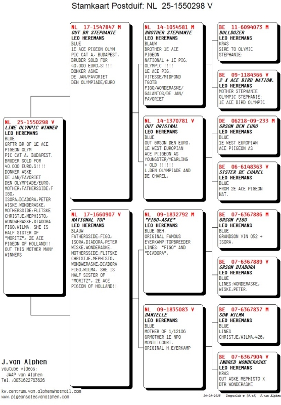 25-1550298 LEO HEREMANS HEN GRFTR BR OLYMPIC WINNER GRFTR BR OF 1E ACE PIGEON OLYM PIC CAT A, BUDAPEST. BRUDER SOLD FOR 40.000 EURO,S!!!! DONKER ASKE DE JAN/FAVORIET DEN OLYMPIADE/EURO. MOTHER:FATHERSSIDE: FIGO,ISORA,DIADORA,PETER WISKE.WONDERASKE. MOTHERSSIDE:FLITSKE CHRISTJE,MEPHISTO, WONDWERASKE,DIADORA FIGO,WILMA. SHE IS HALF SISTER OF "MORITZ", 2E ACE PIGEON OF HOLLAND!! OUT THIS MOTHER MANY WINNERS