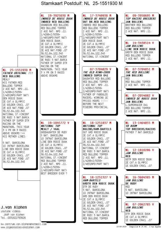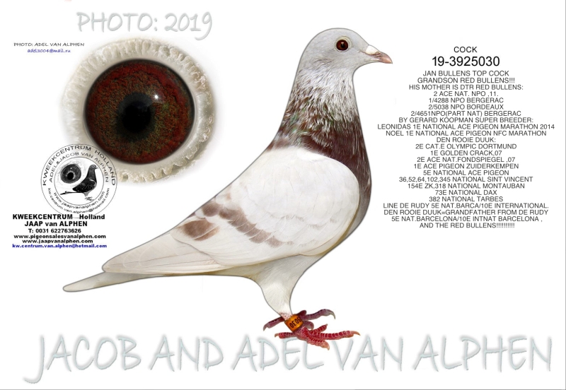 2E ACE PIGEON!!! 25-1551930 100 % JAN BULLENS RED BULLENS GERARD KOOPMAN COCK. HIS GRFATHER:RED BULLENS TOPPER 2 ACE NAT. NPO ,11. 1/4288+2/5038+ 2/4651NPO(PART NAT) DEN ROOIE DUUK: 2E CAT.A OLYMPIC 1E GOLDEN CRACL ,07 2E ACE NAT.FOND ,07 36,52,64,102,345 NATIONAL ST.VINCENT DE RUDI 5 NAT.BARCA FATHER OF SUPER DTR (SO SISTER OF THS COCK) RACING ON THE MARATHON, THIS YEAR 3 X PR ON 3 RACES + 2E ACE PIGEON MARATHON!!!<<< ABOVE 950KMS!!<< HIS MOTHER LINES: 5 NAT. BARCELONA 10 INTNAT BARCELONA LINE DEN ROOIE DUUK 2E CAT.A OLYMPIC 1E GOLDEN CRACL ,07 2E ACE NAT.FOND ,07 36,52,64,102,345 NATIONAL ST.VINCENT RED BULLENS TOPPER 2 ACE NAT. NPO ,11. 1/4288+2/5038+ 2/4651NPO