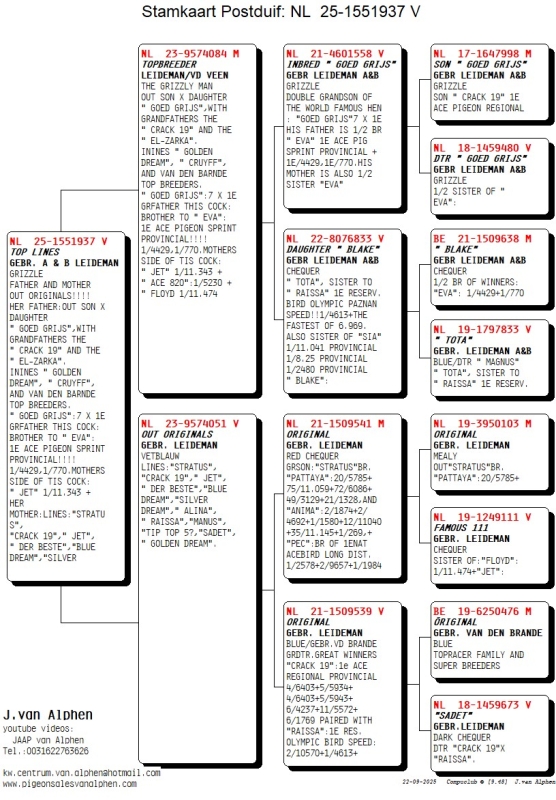 25-1551937 100 % GEBR. A & B LEIDEMAN HEN FATHER AND MOTHER OUT ORIGINALS!!!! HER FATHER:OUT SON X DAUGHTER " GOED GRIJS",WITH GRANDFATHERS THE " CRACK 19" AND THE " EL-ZARKA". ININES " GOLDEN DREAM", " CRUYFF", AND VAN DEN BARNDE TOP BREEDERS. " GOED GRIJS":7 X 1E GRFATHER THIS COCK: BROTHER TO " EVA": 1E ACE PIGEON SPRINT PROVINCIAL!!!! 1/4429,1/770.MOTHERSSIDE OF TIS COCK: " JET" 1/11.343 + HER MOTHER:LINES:"STRATUS", "CRACK 19"," JET", " DER BESTE","BLUE DREAM","SILVER DREAM"," ALINA", " RAISSA","MANUS", "TIP TOP 5?,"SADET",