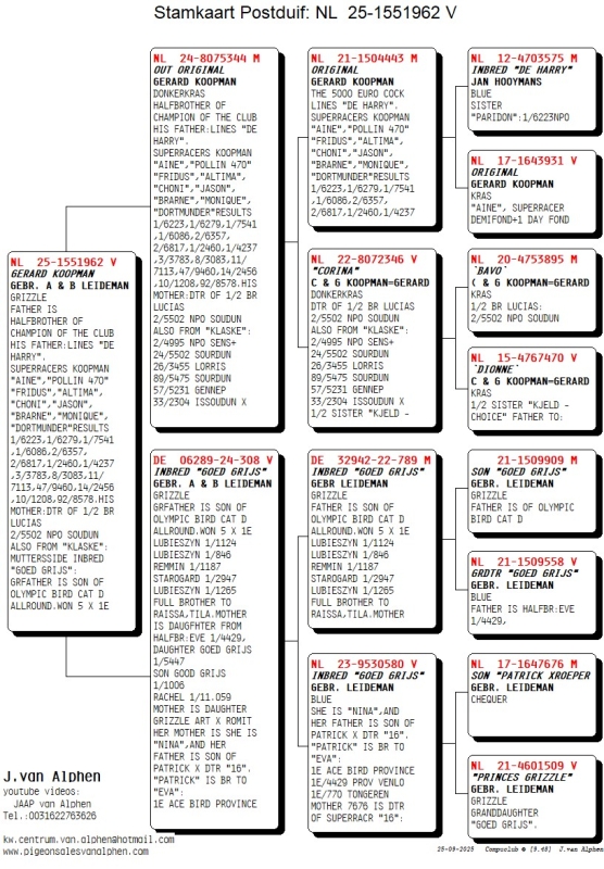25-1551962 GERARD KOOPMAN X GEBR. A & B LEIDEMAN HEN> (INBRED "GOED GRIJS". FATHER IS HALFBROTHER OF CHAMPION OF THE CLUB HIS FATHER:LINES "DE HARRY". SUPERRACERS KOOPMAN "AINE","POLLIN 470" "FRIDUS","ALTIMA", "CHONI","JASON", "BRARNE","MONIQUE", "DORTMUNDER"RESULTS 1/6223,1/6279,1/7541,1/6086,2/6357, 2/6817,1/2460,1/4237,3/3783,8/3083,11/ 7113,47/9460,14/2456,10/1208,92/8578. HIS MOTHER:DTR OF 1/2 BR LUCIAS 2/5502 NPO SOUDUN ALSO FROM "KLASKE": MUTTERSSIDE INBRED "GOED GRIJS": GRFATHER IS SON OF OLYMPIC BIRD CAT D ALLROUND.WON 5 X 1E LUBIESZYN 1/1124 LUBIESZYN 1/846 REMMIN 1/1187 STAROGARD 1/2947 LUBIESZYN 1/1265 FULL BROTHER TO:"TILA"+ "SIA","RAISSA".