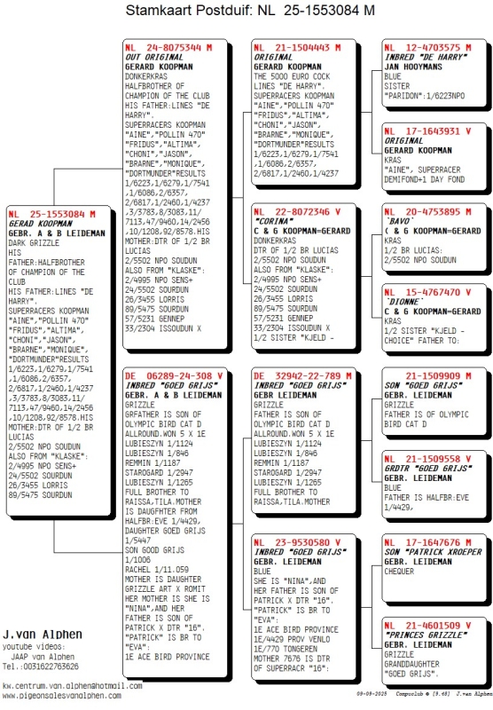 "DARK GRIZZLY BOY". GERARD KOOPMAN X GEBR. LEIDEMAN COCK HIS FATHER:HALFBROTHER OF CHAMPION OF THE CLUB HIS FATHER:LINES "DE HARRY". SUPERRACERS KOOPMAN "AINE","POLLIN 470" "FRIDUS","ALTIMA", "CHONI","JASON", "BRARNE","MONIQUE", "DORTMUNDER"RESULTS 1/6223,1/6279,1/7541,1/6086,2/6357, 2/6817,1/2460,1/4237,3/3783,8/3083,11/ 7113,47/9460,14/2456,10/1208,92/8578.HIS MOTHER:DTR OF 1/2 BR LUCIAS 2/5502 NPO SOUDUN ALSO FROM "KLASKE": 2/4995 NPO SENS+ 24/5502 SOURDUN 26/3455 LORRIS 89/5475 SOURDUN 57/5231 GENNEP 33/2304 ISSOUDUN X 1/2 SISTER "KJELD - CHOICE" FATHER TO: 1E ACE PATTAYA OLR LOFT DREAM 2018 HIS MOTHER IS INBRED "GOED GRIJS" 100% GEBR. LEIDEMAN. "CRACK 19"!!!