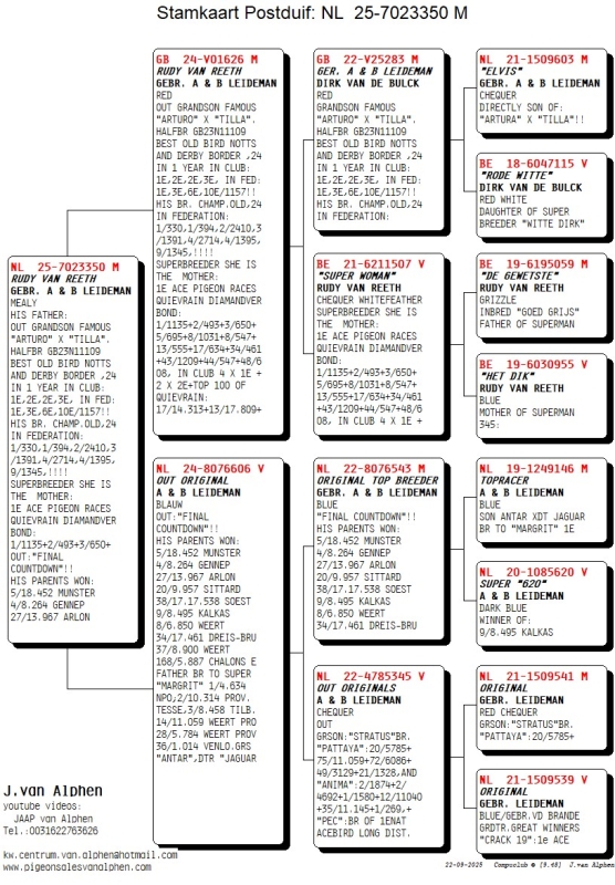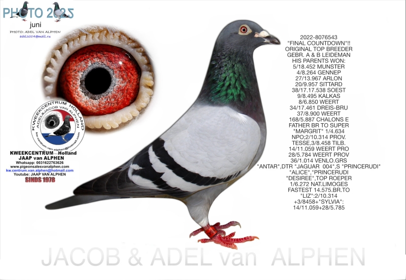 25-7023350 GEBR. A & B LEIDEMAN/ RUDY VAN REETH COCK HIS FATHER: OUT GRANDSON FAMOUS "ARTURO" X "TILLA". HALFBR GB23N11109 BEST OLD BIRD NOTTS AND DERBY BORDER ,24 IN 1 YEAR IN CLUB: 1E,2E,2E,3E, IN FED: 1E,3E,6E,10E/1157!! HIS BR. CHAMP.OLD,24 IN FEDERATION: 1/330,1/394,2/2410,3/1391,4/2714,4/1395, 9/1345,!!!! SUPERBREEDER SHE IS THE MOTHER: 1E ACE PIGEON RACES QUIEVRAIN DIAMANDVER BOND: 1/1135+2/493+3/650+ OUT:"FINAL COUNTDOWN"!! HIS PARENTS WON: 5/18.452 MUNSTER 4/8.264 GENNEP 27/13.967 ARLON 20/9.957 SITTARD 38/17.17.538 SOEST 9/8.495 KALKAS 8/6.850 WEERT 34/17.461 DREIS-BRU 37/8.900 WEERT 168/5887 CHALONS ET C. FATHER TO BR "MARGRIT": 1/4634 NPO,2/10.314 PROV. TESSENDERLO. 3/8458 TILBURG,14/11.059 WEERT,28/5784 PROV. 36/1014.