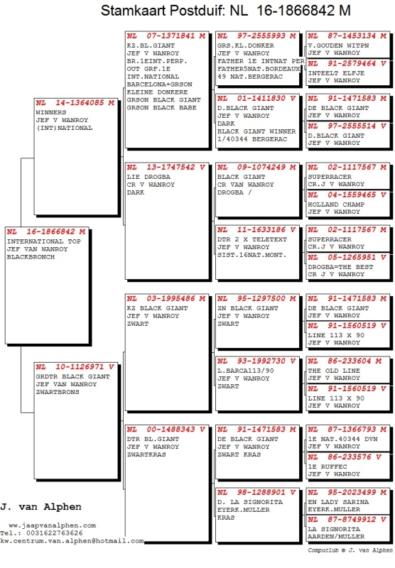 Fantastic Jef van Wanroy cock from International winners lines. His grandfather is the brother of the 1e International Perpignan. The Balck Giant 1e National Bergerac 1/40344 p. Drogba the National Distance champ of Holland. Kleine Donkere the Olympic Pigeon of Holland. "Black Giant": 1 Nat. Bergerac 40.344 p. 19 Nat. Bergerac 19.498 p. 41 Nat. Bergerac 15.679 p. 92 Nat. Ruffec 9.904 p. 1 Ruffec 1.583 p. From his bloodlines: 1e Nat. Montauban 1e Nat. Perpignan 1 Internat. biarritz The Drogba: National Champ long distance. His sister, Nina, Champ National sector 2. !!! 7e National Perigieux 6.985p 15e National Brive 6.536p 25e National Bergerac 17.506p 46e National Perigieux 6.843p 60e National Bergerac 15.517p "Kleine Donkere", the best of Holland 1979, and the Olympic Tokyo. "Olympiade 84"the best of holland 1974, Olympic Blackpool He is from the line "824"1e nat. marseille", directly from "Westerhuis x 90". His gr.son is the father of the 1e Internat. Perpignan, and the grgrfather of the 1e internat. barcelona. "Katja", is from fathersside grdaughter of the famous jan Aarden breeder from batenburg "De Witbuik". From mothersside id "Katja" Jef van wanroy, the line of thew H76-042 1e Internat. barcelona, and "Hartje"1e nat. St. Vincent southe, daughter of the "90". "Katja"was winning the 1e Nat. bergerac with 16.674 p. She is the grmother of "Drogba", the 1e Big Fond champ of holland 2006, and 7e in 2007. Racing 7/6985,15/6536,25/17.506,46/7309,60/7309 on Big Fond. The "Mother of the Loft, the 90 "!!! 4e,7e,36e,184e National St. Vincent 40e National Pau 11e,34e,125e,139 National Dax Out her, of (grand) children: 3 x 1e National St. Vincent 3 x 1e National Marseille 2 x The Best Pigeon of Holland 2 x 1e National Bordeaux 3 x 1e National Barcelona 1e National Bergerac, 26.000p 1e National Dax. ,t ELFJE: 3e national St. Vincent.