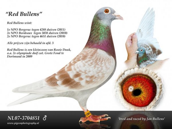 " JULLENSKI", ORIGINAL JAN BULLENS COCK OUT THE BROTHER OF RED BULLENS X INBRED DEN ROOIE DUUK/RED BULLENS. 2 ACE NAT. NPO ,11. 1/4288 NPO BERGERAC 2/5038 NPO BORDEAUX 2/4651NPO(PART NAT) BERGERAC BY GERARD KOOPMAN SUPER BREEDER: LEONIDAS 1E NATIONAL ACE PIGEON MARATHON 2014 NOEL 1E NATIONAL ACE PIGEON NFC MARATHON DEN ROOIE DUUK: 2E CAT.E OLYMPIC DORTMUND 1E GOLDEN CRACK,07 2E ACE NAT.FONDSPIEGEL ,07 1E ACE PIGEON ZUIDERKEMPEN 5E NATIONAL ACE PIGEON 36,52,64,102,345 NATIONAL SINT VINCENT.