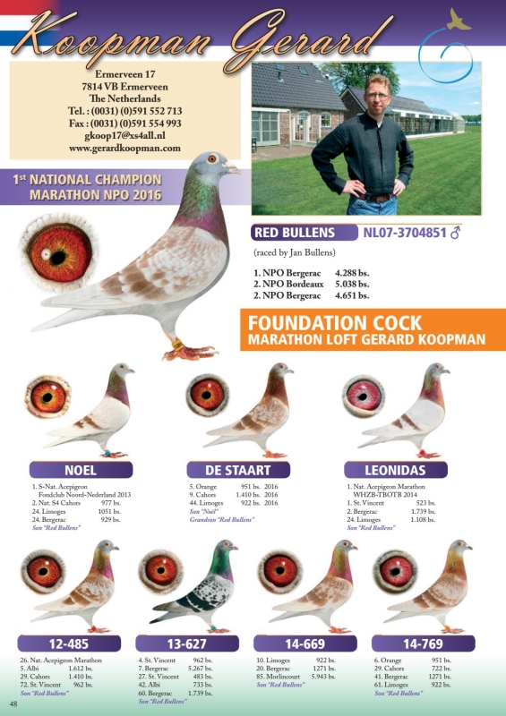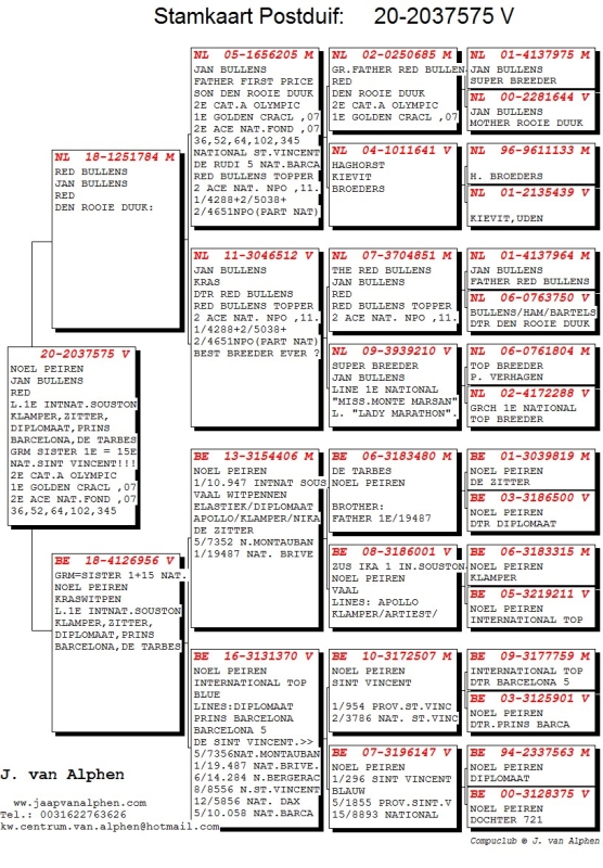 20-2037575 JAN BULLENS/RED BULLENS/NOEL PEIREN HEN: L.1E INTNAT.SOUSTON KLAMPER,ZITTER, DIPLOMAAT,PRINS BARCELONA,DE TARBES GRM SISTER 1E = 15E NAT.SINT VINCENT!!! DWEN ROOIE DUUK 2E CAT.A OLYMPIC 1E GOLDEN CRACL ,07 2E ACE NAT.FOND ,07 36,52,64,102,345 NATIONAL ST.VINCENT DE RUDI 5 NAT.BARCA RED BULLENS TOPPER 2 ACE NAT. NPO ,11. 1/4288+2/5038+ 2/4651NPO(PART NAT) BEST BREEDER EVER ?