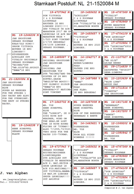 21-1520084 GERARD KOOPMAN X ARJAN BEENS X JAN GROOTOONK COCK HIS FATHER GRSON "ACHILLES"X"VICTORIA(ORIGNALS GERARD KOOPMAN)+ "MICHEL" SON "MR.GIJS",GRSON OLYMPIC MISS GIJSJE"+"EMMA"1E NPO BERGERAC + 37ENAT. SINT VINCENT.(OUT "BLAUWE LYNX"X"CORETTA". THE MOTHER OF THIS COCK IS OUT "FAMOUS 02":2/6086 Lorris NO.WIND, 65/16.256,7/1359,77/8181 ALL 500-730KMS. gRSON BERNARDXHENTE FROM THE SUPER CHAMP. H. SCHEFFEL. 02 WAS PAIRED WITH THE DTR OF "ACHILLES"X"VICTORIA" OF GERARD KOOPAN. "ACHILLES"IS THE SON OF THE FAMOUS "VITALIS". LOOK DOWN PHOTO OF VITALIS THE WINNER<<<<<<<<