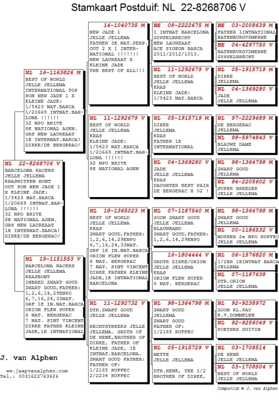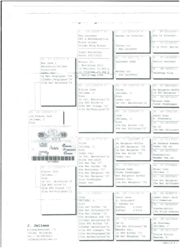 JELLE JELLEMA HEN: GRANDDAUGHTER KLEINE JADE!!!! OUT SON NEW JADE 1 X KLEINE JADE:< 1/5423 NAT.BARCA 1/20669 INTNAT.BAR- LONA !!!!!! 32 NPO BRIVE 8E NATIONAL AGEN. GRS NEW LAUREAAT 1E INTERNAT.BARCA! DIRKE/DE BERGERAC/ BLAUWE DAME.ZW.GOUD ORION,DE HENK(BROTHER DIRKE, FATHER KLEINE JADE!!!!