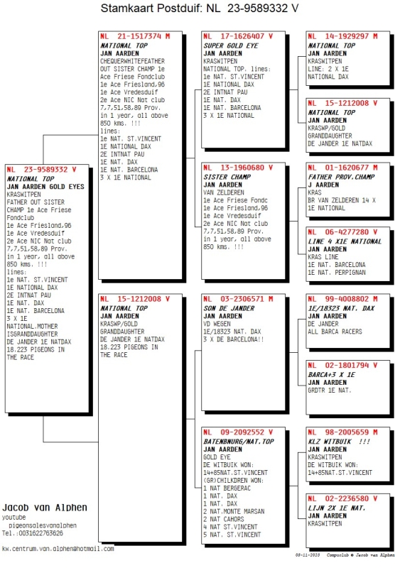 JAN AARDEN NATIONAL TOP HEN, THE GOLD EYES FATHER OUT SISTER CHAMP 1e Ace Friese Fondclub 1e Ace Friesland,96 1e Ace Vredesduif 2e Ace NIC Nat club 7,7,51,58,89 Prov. in 1 year, all above 850 kms. !!! lines: 1e NAT. ST.VINCENT 1E NATIONAL DAX 2E INTNAT PAU 1E NAT. DAX 1E NAT. BARCELONA 3 X 1E NATIONAL.MOTHER ISGRANDDAUGHTER DE JANDER 1E NATDAX 18.223 PIGEONS IN THE RACE