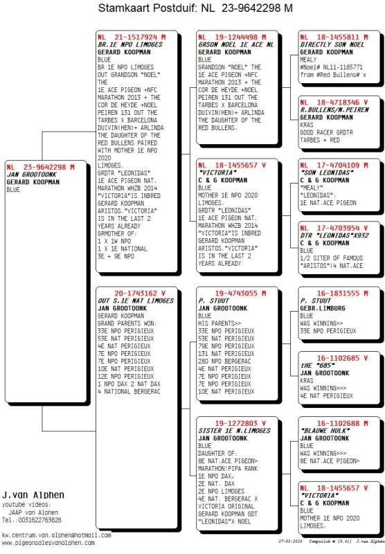 23-9642298 GERARD KOOPMAN X JAN GROOTOONK COCK HIS FATHER IS ½ BR 1E NPO LIMOGES BY JAN GROOTOONK, OUT GRSON NOEL, 1E ACE PIGEON NFC MARATHON X "VICTORIA" OF GERARD KOOPMAN, MOTHER OF 5 PIGEONS INT TOP TOP NPO/NATIONAL IN 2 YEARS TIME. MOTHER OF THIS COCK IS OUT THE I P. STUUT COCK(SUPER RACER, OUT 4E NATIONAL) X ½ SISTER 1E NPO LIMOGES. THIS COCK IS INBRED OF "VICTORIA"DE SUPERBREEDER. GARANTY COCK FOR MARATHON BREEDING. VICTORIA GAVE IN 3 YEARS YOUNGSTERS 5 X IN TOP 5 NATIONAL s