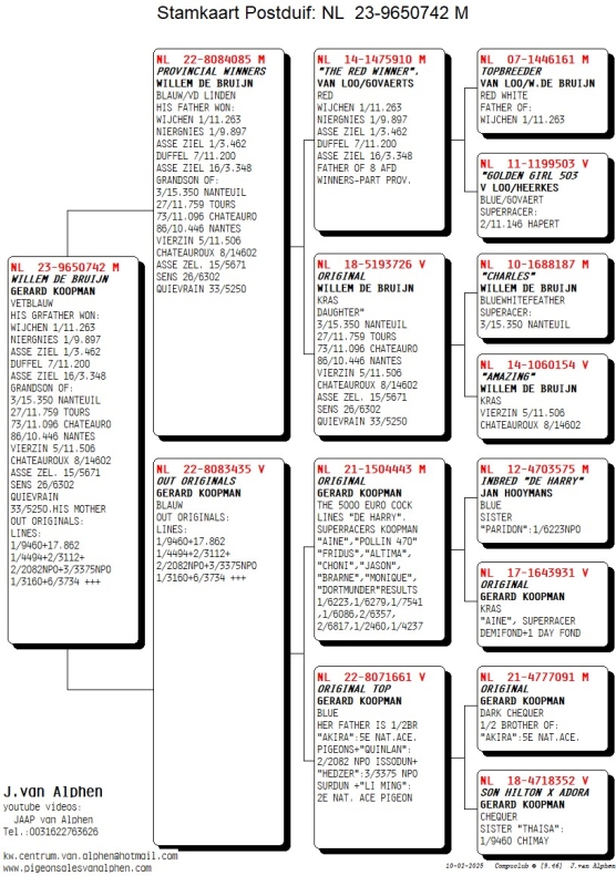 23-9650742 GERARD KOOPMAN/A.J. VAN DER LINDEN HIS GRFATHER ORIGINAL TOP CHAMPION A.J. VAN DER LINDEN WON: WIJCHEN 1/11.263 NIERGNIES 1/9.897 ASSE ZIEL 1/3.462 DUFFEL 7/11.200 ASSE ZIEL 16/3.348 GRANDSON OF: 3/15.350 NANTEUIL 27/11.759 TOURS 73/11.096 CHATEAURO 86/10.446 NANTES VIERZIN 5/11.506 CHATEAUROUX 8/14602 ASSE ZEL. 15/5671 SENS 26/6302 QUIEVRAIN 33/5250.HIS MOTHER OUT ORIGINALS: GERARD KOOPMAN LINES:LINES "DE HARRY". SUPERRACERS KOOPMAN "AINE","POLLIN 470" "FRIDUS","ALTIMA", "CHONI","JASON", "BRARNE","MONIQUE", "DORTMUNDER"RESULTS 1/6223,1/6279,1/7541,1/6086,2/6357, 2/6817,1/2460,1/4237,3/3783,8/3083,11/ 7113,47/9460,14/2456,10/1208,92/8578. THE FATHER OF THIS COCK IS ½ BROTHER OF 8 PROVINCIAL WINNERS ADRI VAN DER LINDEN IS BREEDER OF "FEMKE", 88000 EURO,S, LATER ++ TO CHINA.