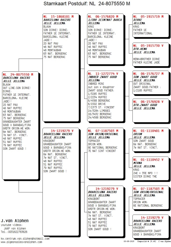 2024-8075550 JELLE JELLEMA COCK OUT LINE:SON DIRKE! DIRKE: FATHER 1E INTERNAT. BARCELONA, KLEINE JADE!! 20 NAT PAU 46 NAT RUFFEC 48 MONTAUBAN 63 NAT. BERGERAC 75 NAT BERGERAC GRANDDAUGHTER ZWART GOUD X BARABAS/FIRA GRDTR ORION:HE WON: 6e NAT. BERGERAC 7e NAT ST. VINCT. 48 NAT RUFFEC 51 NAT RUFFEC 79 NAT RUFFEC SON ZWART GOUD !