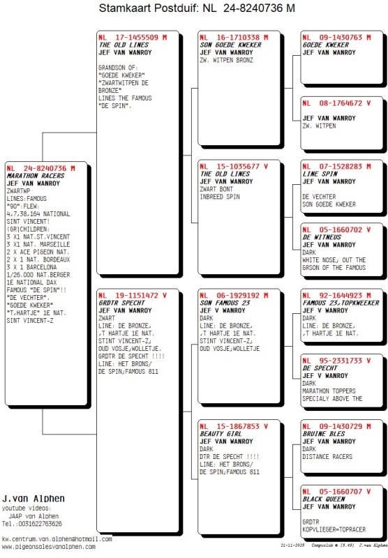 24-8240736 JEF VAN WANROY COCK LINES:FAMOUS "90":FLEW: 4,7,38,164 NATIONAL SINT VINCENT! (GR}CHILDREN: 3 X1 NAT.ST.VINCENT 3 X1 NAT. MARSEILLE 2 X ACE PIGEON NAT. 2 X 1 NAT. BORDEAUX 3 X 1 BARCELONA 1/26.000 NAT.BERGER 1E NATIONAL DAX FAMOUS "DE SPIN"!! "DE VECHTER". "GOEDE KWEKER" "T,HARTJE" 1E NAT. SINT VINCENT-Z