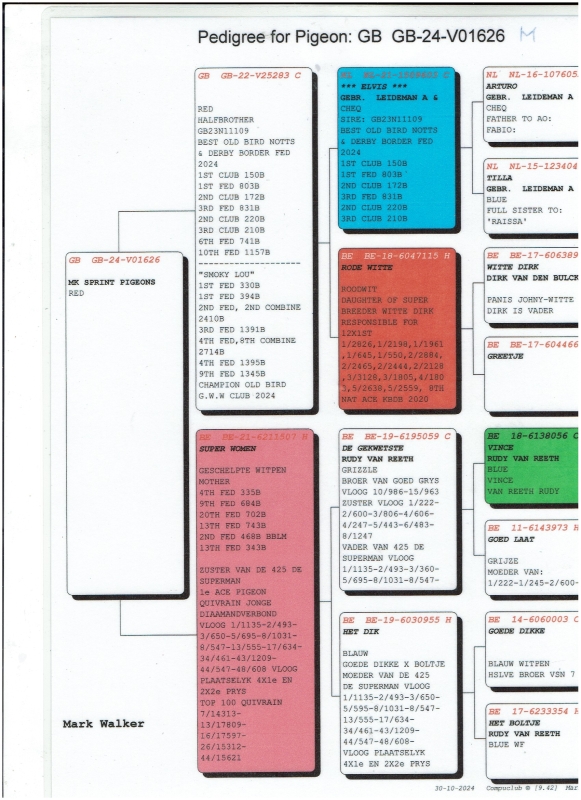 GB2024-V01626 GBR. LEIDEMAN X DIRK VAN DE BULCK COCK SUPER FOR THE BREEDING LOOK PEDEGREE FOR THE RESULTS LINES: THE NEW GEBR. LEIDEMAN SUPER PAIR "ARTURO X "TILLA","ELVIS". DIRK VD BULCK:"RODE WITTE", "WITTE DIRK". RUDY VAN REETH:"SUPER WOMAN" (TOP RACER)!! "DE GEKWETSTE": OUT BROTHER "GOED GRIJS" , "VINCE","HET DIK","GOEDE DIKKE", "HET BOLTJE".