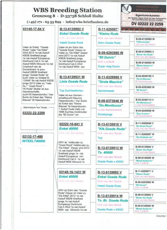 Dv 2222-22-2259 DIRK VAN DE BULCK COCK INBRED "GOEDE RODE" THE FATHER OF "DE KITTEL". IN 2013 1E NATIONAL ACE PIGEON BELGIUM SPRINT YOUNGSTERS + 1E ACE PIGEON EUROPACLUB DORTMUND CAT A. 1E NAT. MSN ACE PIGEON ALLROUND + 1E NATIONAL CRACKDUIF FROM THE NEWSPAPER. "GOEDE RODE" IS ALSO THE FATHER OF "GREIPEL", 6E NAT. ACE PIGEON YOUNGSTERS. MORE IN HIS BLOOD: FAMOUS "4000", "DE MONTLUCON", "GROTE MAURICE"," KLEINE RODE","80-DUIVIN. VERY STRONG COCK.